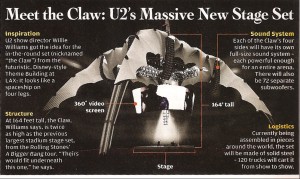 Alta 164 piedi, the Claw è alta il doppio rispetto al palco che deteneva il titolo di Stage Set più alto del mondo, cioè quello dei Rolling Stone, nel Bigger Bang Tour 2006-2007, “Il loro palco entrerebbe sotto questo tranquillamente” dice Williams.