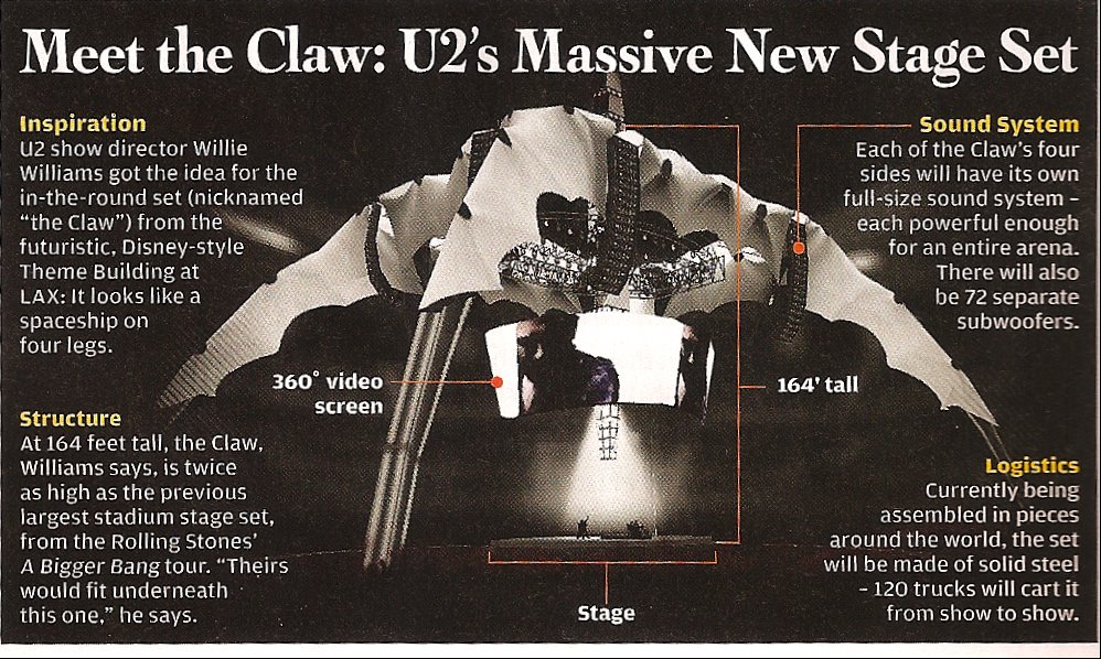 Willie Williams, il direttore artistico degli U2, ha avuto l’idea di questo palco tondo (soprannominato “the Claw”) avveneristico. Assomiglia ad una navicella spaziale su 4 gambe.