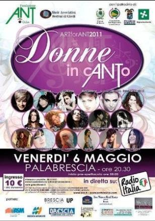 Venerdì 6 maggio si terrà al Pala Brescia la manifestazione Art for ANT 2011-Donne in cANTo, dove 17 artiste della musica italiana si esibiranno in un concerto di beneficenza a favore della Fondazione ANT Italia Onlus. Biglietti gia’ esauriti!
