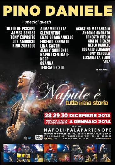 Il progetto “tuttanatastoria” nasce qualche anno fa, dall’ idea avuta da Pino Daniele di riunire in un unica super-band tutti i protagonisti del Neapolitan Power degli anni 70, infatti al debutto del primo tour, il chitarrista napoletano riunisce i mitici componenti della sua band: Rino Zurzolo, James Senese, e Joe Amoruso. La serata fu memorabile, un salto nel primo blues di Pino Daniele, con le vibranti tastiere di Amoruso e il sax imponente di Senese entusiasmarono il pubblico presente.Successivamente per ricordare il memorabile concerto del Palapartenope verrà realizzato un cd/dvd celebrativo della serata. L’appuntamento si rinnova, a fine dicembre ed a inizio gennaio con 4 date imperdili, già andate sold-out, il “Napul’è Tutta n’ata storia” al Palapartenope di Napoli il 28,29,30 dicembre e il 4 gennaio diventerà l’evento musicale di fine anno che tutta la città aspetta. Al fianco di Pino Daniele ci saranno i più grandi protagonisti della scena prog-rock italiana degli anni 70, insieme a oltre 20 special guest:Almamegretta, Clementino, Enzo Gragnaniello, Eugenio Bennato, Jenny Sorrenti, Lina Sastri, Napoli Centrale, Nccp, Osanna, Teresa De Sio, ed ancora Toni Cercola, Antonio Onorato, Ernesto Vitolo, Agostino Marangolo, Gigi De Rienzo, Nello Daniele, Rosario Jermano, , Elisabetta Serio, ‘A67e tanti altri. Un super concerto, una storia musicale, tutti i migliori artisti degli anni 70 ed 80 protagonisti di quella che fu la nuova scena musicale partenopea. L’evento, prodotto e organizzato da55AVE Entertainment e F&P Group, si avvalerà della collaborazione di Radio Italia. I biglietti per la data del 4 gennaio e gli ultimi biglietti per le date del 28, 29 e 30 dicembre sono in vendita su www.ticketone.it e nei punti vendita e nella prevendite abituali di Go2 e Ticketone (per informazioni: www.fepgroup.it).