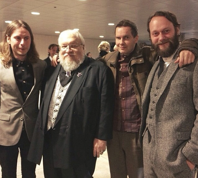 Last September, we noted that Sigur Rós would make an appearance on the fourth season of HBO’s “Game of Thrones”. It’s not just rabid fandom drawing them to the show: They’ll be covering “The Rains of Castamere” for the show’s soundtrack, as Consequence of Sound points out (via Film Music Reporter). That’s the band posing with “Game of Thrones” author George R.R. Martin above, via their Instagram.